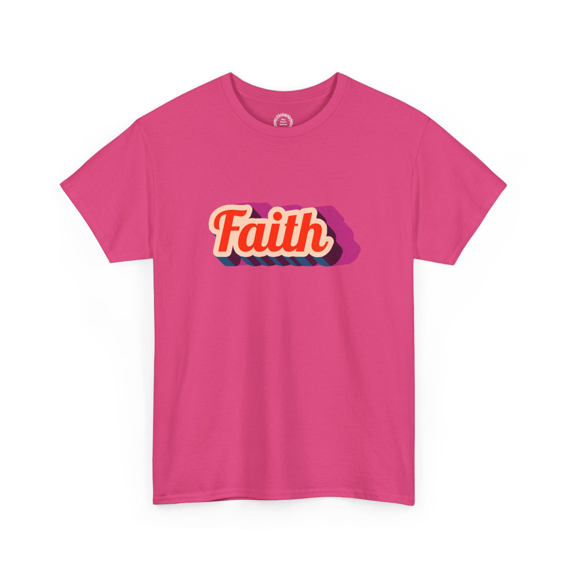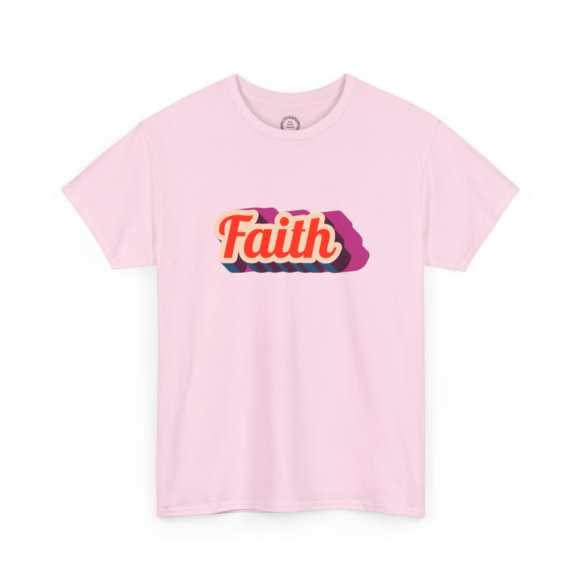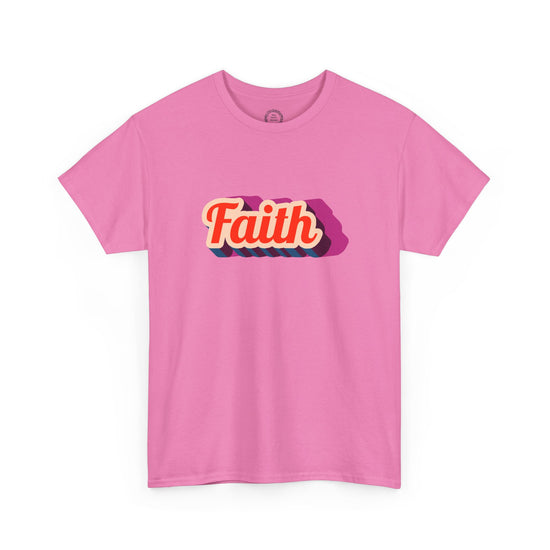 A soft, everyday tee that quietly carries a message: Faith. The design sits centered on a light pink canvas, rendered in warm retro lettering with a layered shadow for depth and movement. Wear it on slow mornings with coffee, at community gatherings, or when you want a gentle reminder to breathe and keep going. The relaxed crew neck and classic fit let the shirt drape easily over jeans or a skirt. It feels lived-in from the first wear — not flashy, just steady and reassuring. Subtle enough to layer under a jacket, bold enough to start small conversations, this tee blends comfort and meaning for people who value warmth and quiet optimism.